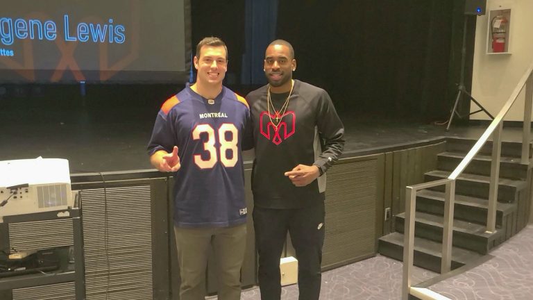 De passage à l’école secondaire Laval Senior Academy, Christophe Normand et Eugene Lewis des Alouettes de Montréal ont discuté avec plusieurs jeunes de leur parcours et de l’importance de l’école.