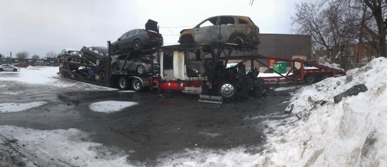 ll était autour de 3h42 quand des témoins ont contacté le 911 après avoir aperçu un camion lourd et sa remorque, sur laquelle étaient installées huit automobiles, en flammes.
